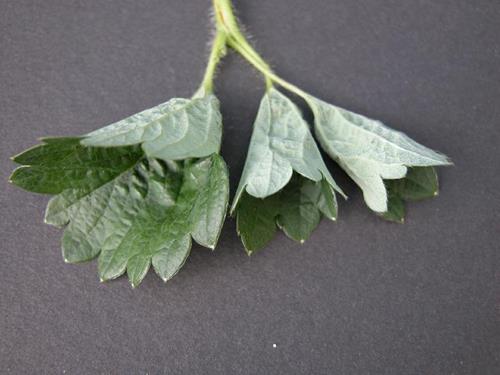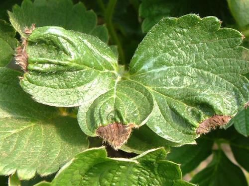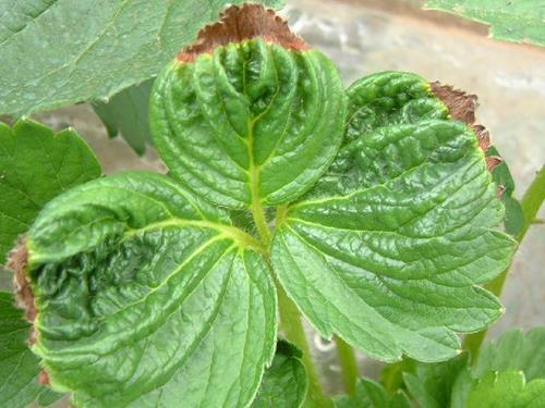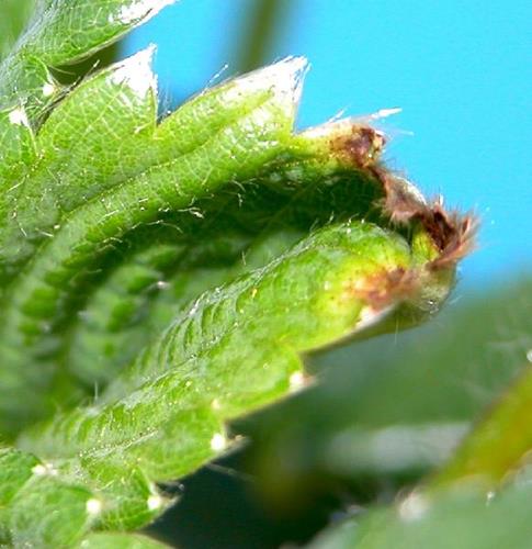 Junges Blatt mit nekrotischer Spitze. Die Blattspreite ist gekräuselt.