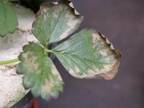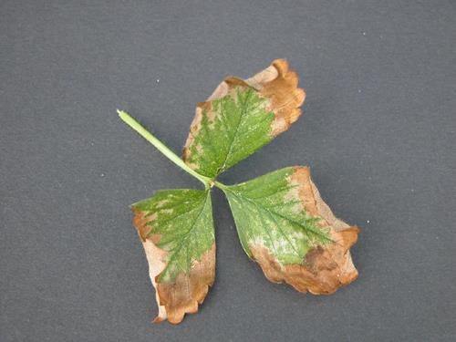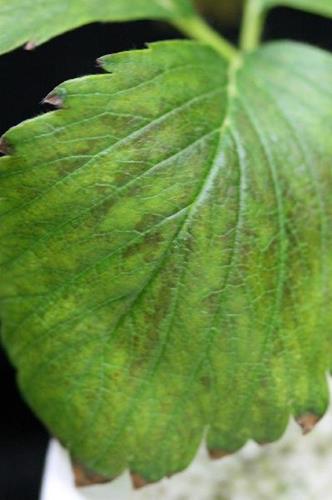Chlorosen zwischen den Blattadern mit nekrotischen Flecken an den Rändern und dunklen Bereichen zwischen den Adern. Ältere Blätter sind zuerst betroffen.