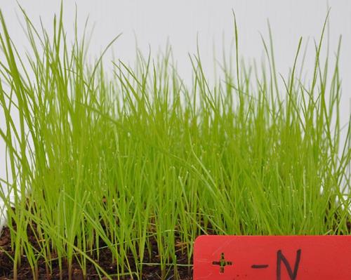 Hellgrüne Farbe mit gelblicher Blattbasis, reduziertem Wuchs und verminderter Bodenbedeckung aufgrund von Stickstoffmangel.