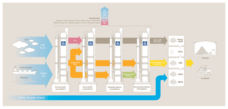 In modernen Werken wird Stickstoff-Dünger aus Erdgas hergestellt. In mehreren Verarbeitungsschritten wird das Erdgas, im Wesentlichen Methan, durch die Verbindung mit Stickstoff aus der Luft in einen stickstoffhaltigen Dünger veredelt. 80 % des Gases dienen dabei als Rohmaterial für den Dünger, während die restlichen 20 % zur Erhitzung und zur Stromerzeugung dienen. Abbildung 1 zeigt eine typische Düngemittelproduktion, wobei allerdings nicht alle Werke sämtliche Verarbeitungsschritte durchführen. Ausgehend von den zwei Hauptprodukten, Ammoniumnitrat und Harnstoff, werden durch Beimischung unterschiedlicher Rohstoffe verschiedene Arten von Düngemitteln hergestellt. Für NPK-Dünger beispielsweise werden Phosphor und Kalium beigegeben, KAS-Dünger enthalten zusätzlich Dolomit und die Mischung von Harnstoff und Ammoniumnitratlösung ergibt AHL.