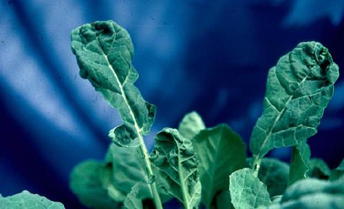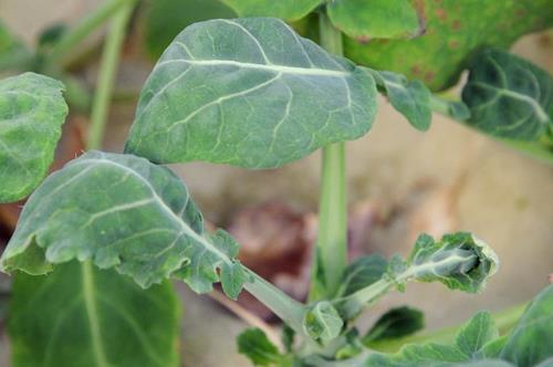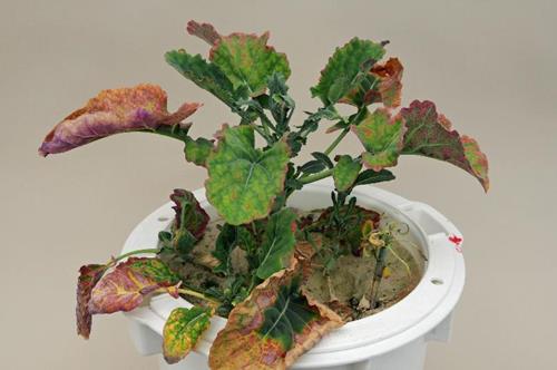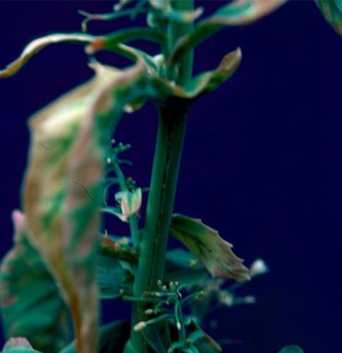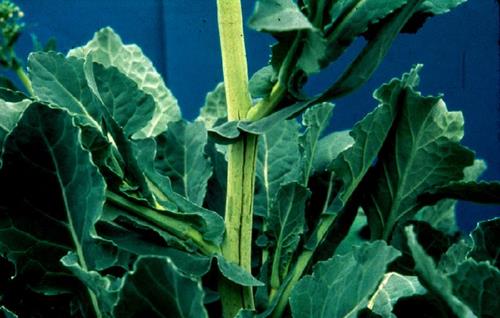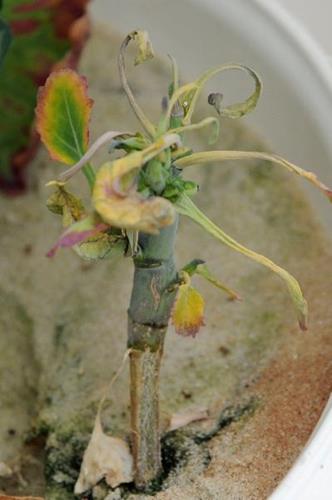 Verkürzte Internodien am Spross führen zu einem gestauchten Erscheinungsbild. In Stängeln und Strünken treten Risse und hohle Stellen auf.