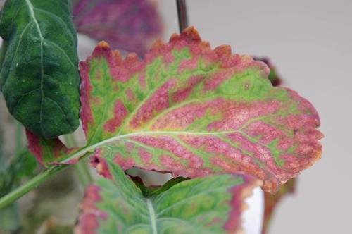 Bormangel. Blattrand-Deformationen an jungen Blättern sind ähnlich wie bei Ca-Mangel.