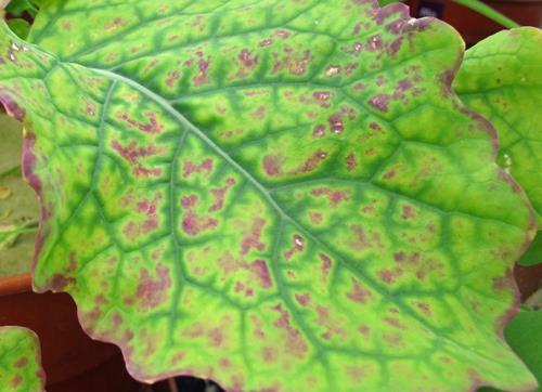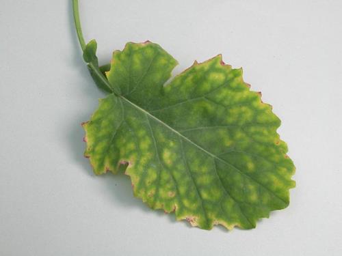 Magnesiummangel zeigt sich zunächst immer an älteren Blättern, deren Gewebe sich zwischen den Blattadern chlorotisch verfärbt. Ein schmaler Saum beidseitig der Blattadern bleibt grün. Die Blattränder und nachfolgend auch die Interkostalbereiche werden nekrotisch.