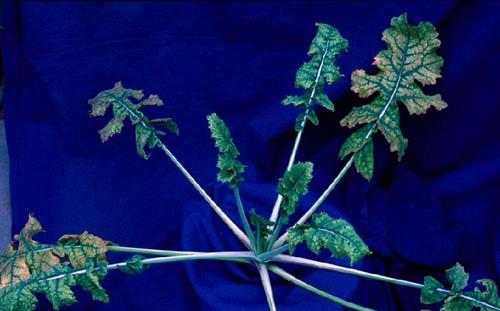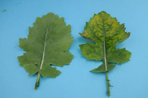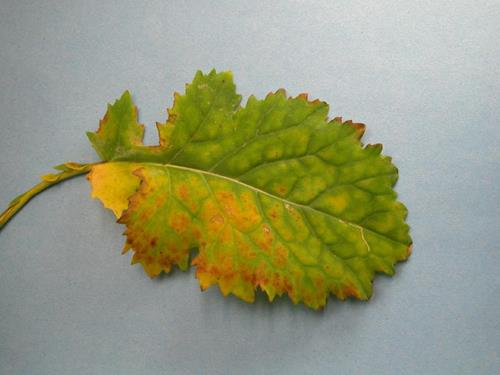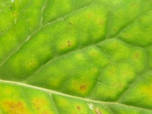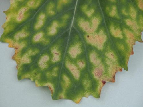 Magnesiummangel. Fe- und Mn-Mangel verursachen ebenfalls Interkostalchlorosen und -nekrosen, die Symptome beginnen jedoch an jüngeren Blättern.