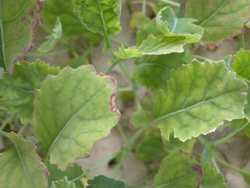 Magnesiummangel wird immer zuerst an den älteren Blättern sichtbar. Chlorose entwickelt sich zwischen den Blattadern. Ein schmaler Saum beidseitig der Blattadern bleibt grün. Später werden die Blattränder und chlorotische Interkostalbereiche nekrotisch.