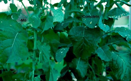 Molybdänmangel vs. gesunde pflanze wird verschlimmert durch