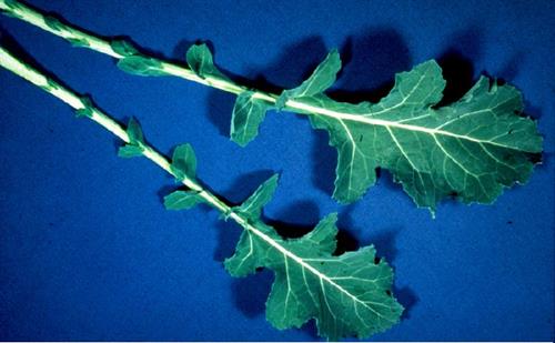 Blattspreiten sind reduziert, in schweren Fällen bis zur Mittelrippe ("Peitschenstiel-" oder "Whiptail"-Erkrankung). Zwischen den Blattadern treten Perforationen auf.