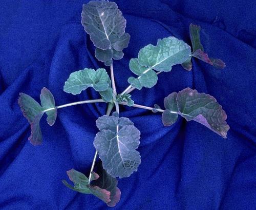 Ältere Blätter weisen entlang der Ränder eine deutlich rötliche/violette Färbung auf. Die gesamte Blattspreite einschließlich der Blattadern und der Blattstiele zeigt eine blasse, rötliche Tönung.