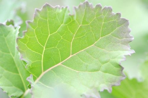 Ältere Blätter weisen entlang der Ränder eine deutlich rötliche/violette Färbung auf. Die gesamte Blattspreite einschließlich der Blattadern zeigt eine blasse, rötliche Tönung.