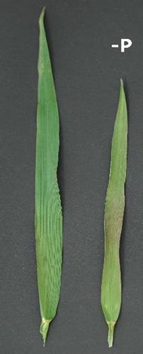 Pflanzen mit P-Mangel sind kleiner als üblich und zeigen eine rotviolette Tönung auf ihren dunkelgrünen Blättern, vor allem in der Blattmitte.