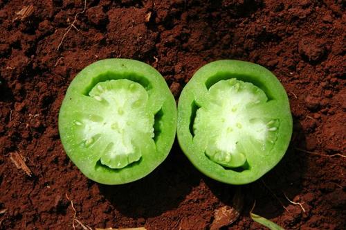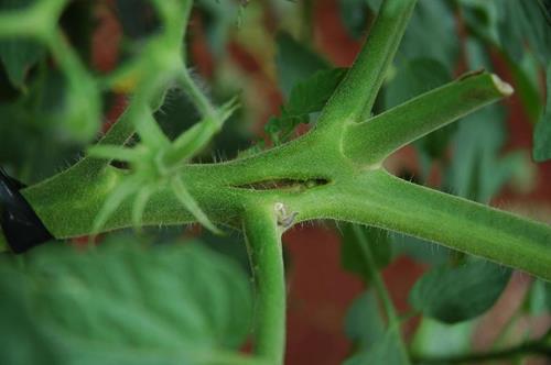 Auch bei schwerem Ca-Mangel stirbt der Vegetationspunkt ab und die jungen Blätter sind deformiert, aber in diesem Fall sind die Blattspitzen und -ränder weißer und die Früchte zeigen Blüten-Endfäule.