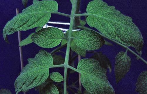 Tomaten sind anfällig für Manganmangel. Zu einer vorübergehende Unterversorgung kann es besonders in Phasen sehr schnellen Wachstums kommen. Im Freiland sind hohe Niederschläge oder leichte Böden mit hohem pH mögliche Ursachen.