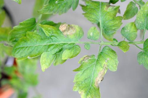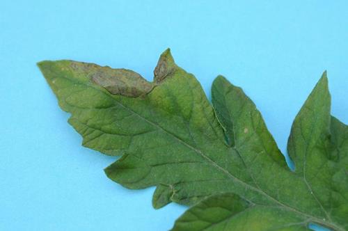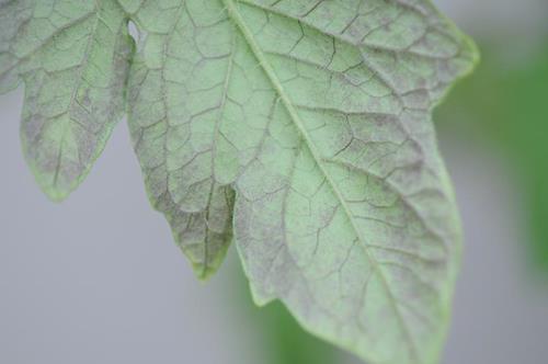 Außerdem dehnen sich vom Blattrand her chlorotische und nachfolgend nekrotische Stellen aus. Die Nekrosen können eine braune oder eine matte, dunkel-olivgrüne Färbung aufweisen.