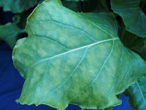 An jüngeren Blättern zeigen sich Interkostal-Chlorosen, während die Blattadern sowie ein schmaler Saum um sie herum grün bleiben ("nadelbaumähnlich").
