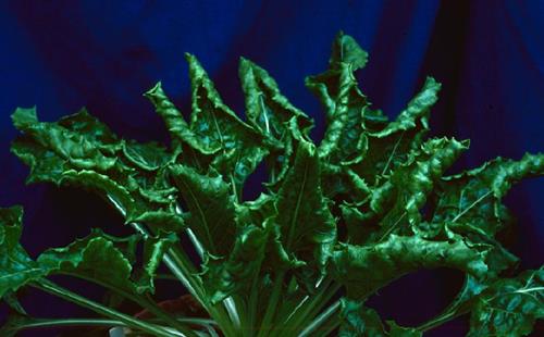 Manganmangel führt zu löffelförmigem Aufrollen der jüngeren Blätter sowie zu einer steif-aufrechten Wuchsform.