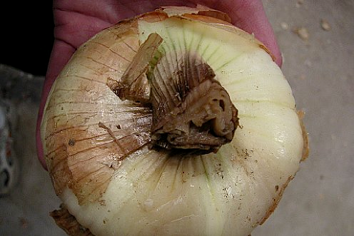 Zwiebeln sind auch sehr anfällig für Blattkrankheiten und Zwiebelfäule, wie z. B. schleimige oder "saure" äußere Schuppen, eine bakterielle Krankheit, die die Qualität der Zwiebeln erheblich mindert.
